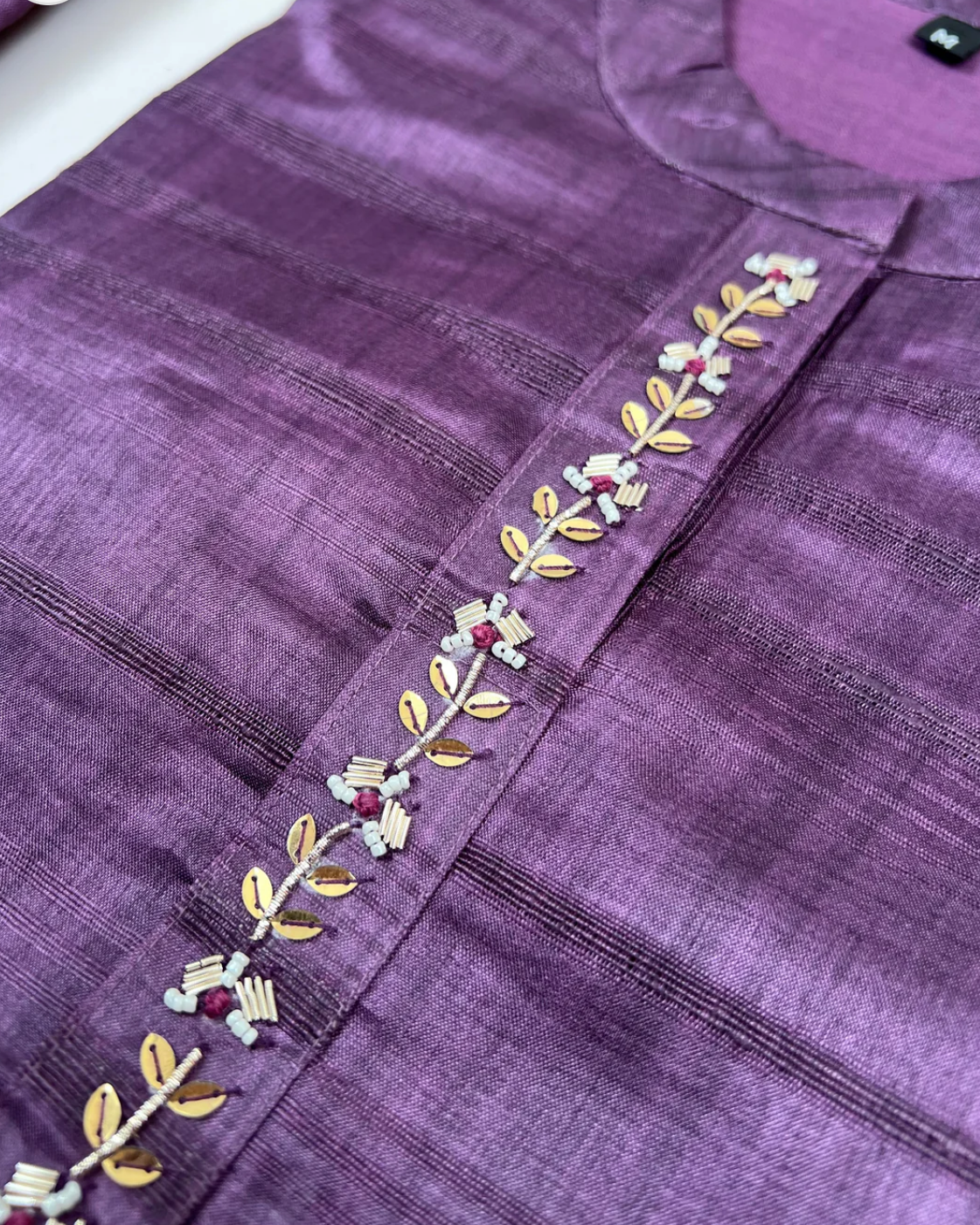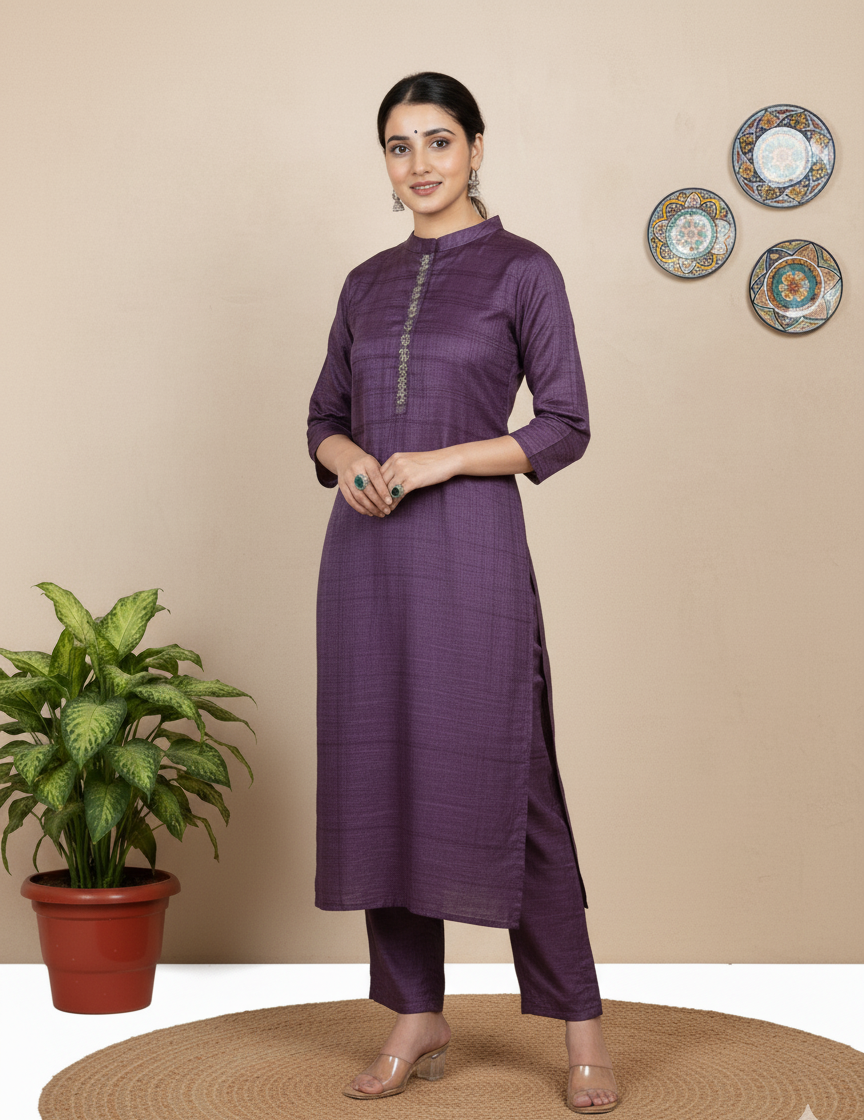 Artisan Handwork: Detailed Mandarin collar neckline embroidery for elegance.
