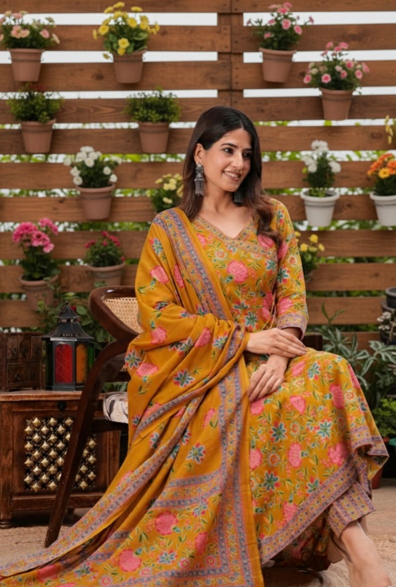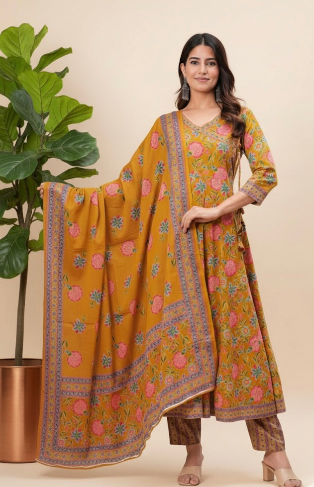 Mustard Floral Cotton: Vibrant block prints on a breezy Anarkali silhouette.