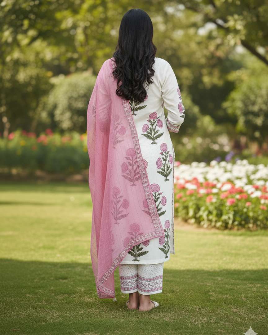 Charming Block Print: Beautiful pink floral motifs on crisp white.