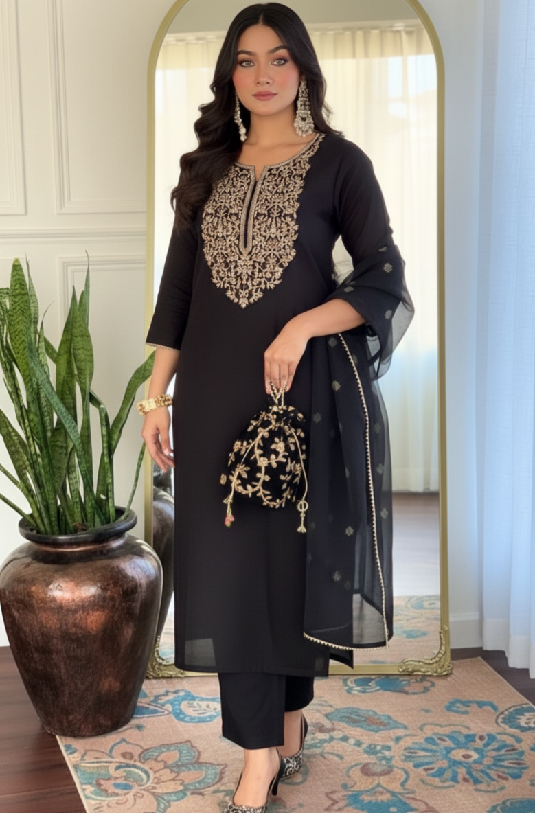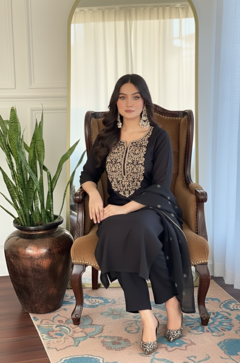 Black Tie Elegance: Striking gold embroidery on a classic black Viscose rayon kurti and styled with a matching net dupatta with golden borders.